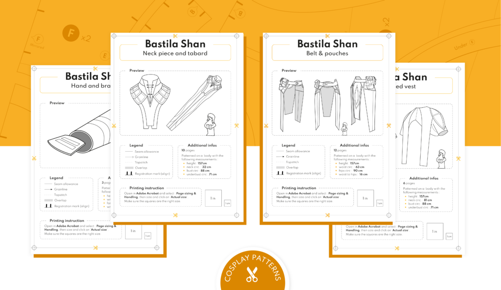 You'll get the pattern bor Bastila Shan's costume : back panel, side panels, belt, bracers & hand padding, neck piece, pauldrons, pouches, tabard and vest !